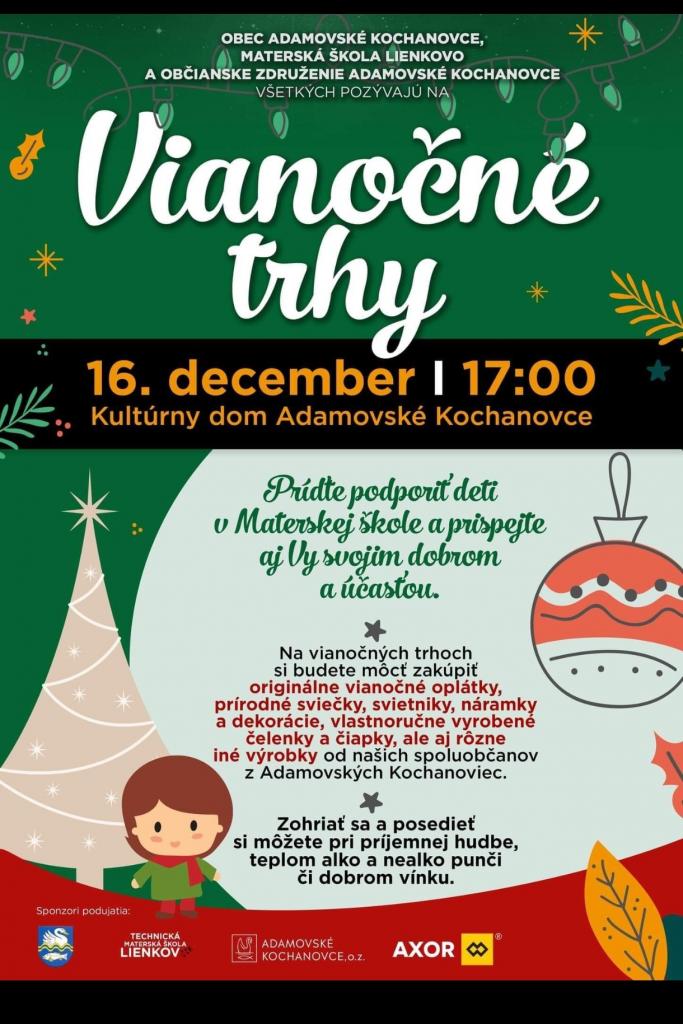 OBEC ADAMOVSKÉ KOCHANOVCE, MATERSKÁ ŠKOLA LIENKOVO A OBČIANSKE ZDRUŽENIE ADAMOVSKÉ KOCHANOVCE VŠETKÝCH POZÝVAJÚ NA VIANOČNÉ TRHY.